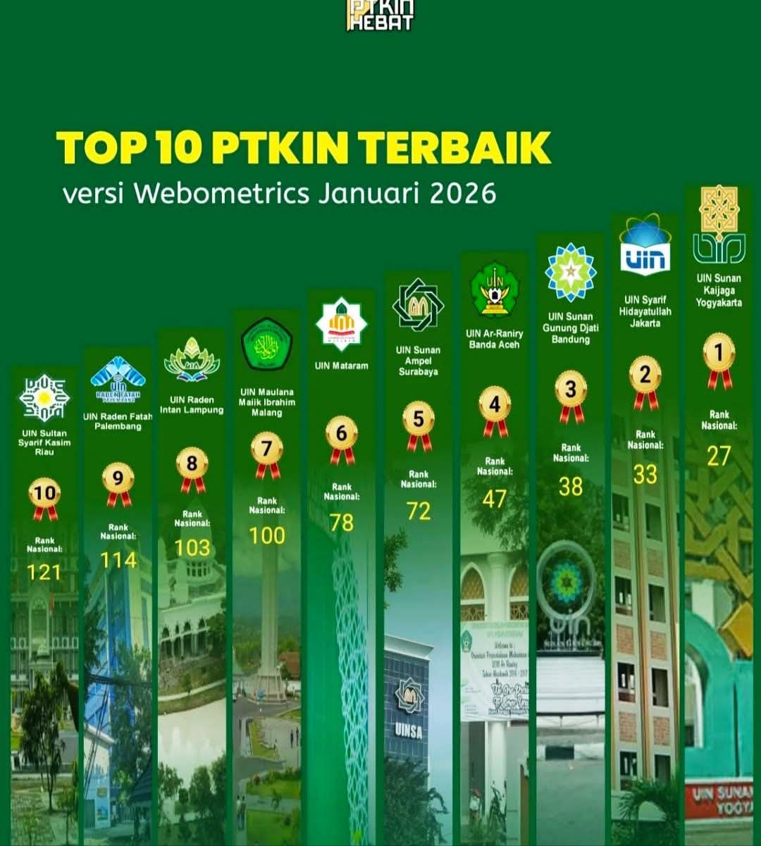 “PTKIN terus berkembang dan makin kompetitif, bahkan dibanding perguruan tinggi umum. Berdasar rilis terbaru Webometrics ada 7 PTKIN yang masuk 100 besar,” terang Direktur Pendidikan Tinggi Keagamaan Islam, Sahiron, di Jakarta, Sabtu (10/1/2026).